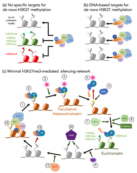 - Laugesen, A.; Højfeldt, J.W.; Helin, K. Molecular Mechanisms Directing PRC2 Recruitment and H3K27 Methylation. Mol. Cell 2019, 74, 8–18. [Google Scholar] [CrossRef]