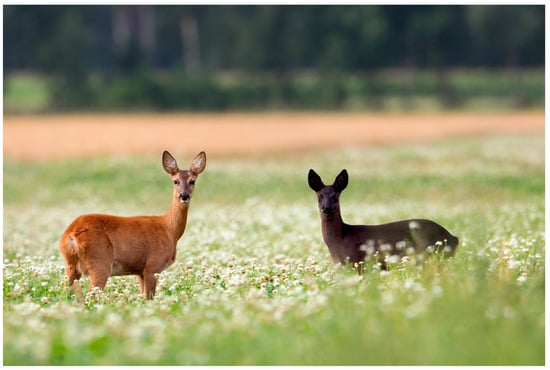 In mammals, basic coat coloration of hair and skin is defined by the ratio and distribution of the pigments eumelanin and pheomelanin []. Melanism is a mutation that increases the production of eumelanin in skin and hair. The darkish color of the eumelanin has a phenotypic expression from dark brown to black fur and skin []. In European roe deer, melanistic animals are characterized by a black coat and skin whereas the common phenotype ranges from reddish to chestnut (Figure 1).