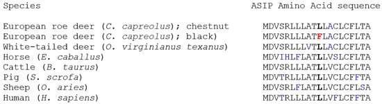 Alignment of amino acid sequences for the first part of ASIP exon 1 (AS1 to AS20) for white-tailed deer (GenBank XM_020889165), horse (GenBank AF288358), cattle (GenBank AH013175), pig (GenBank GQ373180), sheep (GenBank EU420022), and human (GenBank NM_001672). AA p.11 is bold, change in melanistic European roe deer is red, interspecific amino acids are blue.