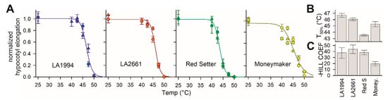 Four tomato genotypes were selected for the analysis. Two are described as thermotolerant (LA2661, alias “Nagcarlang”, and LA1994) by the Tomato Genetics Resource Center (TGRC) based on previous studies [,]. In addition, Moneymaker and Red Setter were included in the analysis. Moneymaker is a frequently used model in tomato HS research [,,,]. For Red Setter, a large TILLING population exists []. Thermotolerance was examined in seedlings and was defined based on the hypocotyl elongation capacity of seedlings after a short HS treatment ranging from 40 to 50 °C (Figure 1A). The inhibition of growth by HS for each genotype was analyzed by standard T50% determination (Equation (1)). LA2661 and LA1994 have the highest T50%, followed by the intermediate value for Moneymaker, while Red Setter has the lowest T50% (Figure 1B). Instead, based on the Hill co-efficient, Moneymaker has an increased eustress range, while the other three are similar (Figure 1C). The onset of growth inhibition under elevated temperatures for Moneymaker is as early as that found for Red Setter, while the 50% growth inhibition of Moneymaker is observed at the same temperatures as for the two more heat tolerant genotypes. Thus, LA2661 and LA1994 are more HS tolerant than Red Setter. Moneymaker shows a more gradual response range to heat that is intermediate when compared to the other three genotypes.