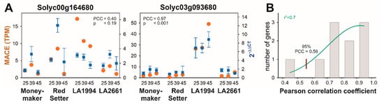 A transcriptome analysis was performed on mRNA from hypocotyls of seedlings exposed to different temperatures to identify genes defining the differences in thermotolerance. Before the in-depth analysis of the transcriptome determined by MACE, the reliability of the MACE results was confirmed by quantitative RT-PCR on ten randomly selected genes (Figure 2A and Figure S1). The profile of the transcripts of gene with the lowest correlation between both experimental approaches differs in the transcript abundance in LA1994, while the global trend of the transcript abundance is conserved (Figure 2A, Solyc00g164680). The distribution of the Pearson correlation coefficient (PCC) between the expression profiles determined by MACE and by qRT-PCR was analyzed by a Gaussian distribution yielding a 95% confidence for a correlation of at least PCC = 0.56, which confirms the reliability of the MACE results (Figure 2B).
