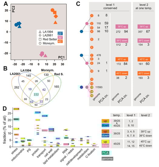 The abundance of the transcripts of genes coding for proteins assigned to different functional categories based on MapMan [] was determined. To reduce the complexity, the classes representing genes upregulated or downregulated at 39 °C and 45 °C, as well as upregulated or downregulated at 39 °C or 45 °C when compared to 25 °C were merged (Figure 3D, legend). The transcript abundance of genes in different categories was compared to the abundance of the category in the entire genome (Figure 3D, dashed line). In addition, the 222 genes selected by the PCA-based method were categorized as well (Figure 3D, green).