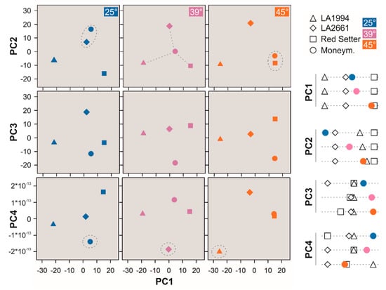PC1 (43% of the variation) discriminates LA1994, LA2661 and Red Setter at each of the three temperatures (Figure 4, Table S5). PC2 (31% of the variation) separates the expression profile of LA2661 from that of LA1994 (Figure 4). Red Setter is separated at 25 °C, but its expression profile becomes more closely related to that of LA1994 at higher temperatures (Figure 4). Thus, LA2661 seems to be more distinct in its expression profile from LA1994 than Red Setter, although LA2661 and LA1994 show a comparable thermotolerance (Figure 1). PC3 (25% of the variation) unifies the expression profile of LA2661 and LA1994 (Figure 4). Red Setter is clustered at 25 °C with these two genotypes but becomes distinct at 45 °C (Figure 4). PC4 (<1% of the variation) shows an increasing discrimination between LA2661 and LA1994 with increasing temperatures, while Red Setter is distinct at 25 °C, comparable to LA1994 at 39 °C and but also distinct from the other two genotypes at 45 °C (Figure 4).