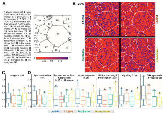 To examine whether particular pathways contribute to the observed genotype-specific transcriptome variations, the 1393 genes contributing the most to PC1 and PC2 (methods) were assigned to MapMan functional categories []. To visualize differences among the different genotypes a Voronoi Treemap structure was created as described in Section 2.7 (Tables S5 and S8). The transcripts of most genes contributing to PC1 and PC2 at 25 °C are more abundant in LA1994 and Moneymaker compared to the other two genotypes (Figure 5A–C). This holds especially true for genes involved in stress response (Figure 5B,D). The transcript abundance of genes involved in lipid metabolism, hormone-based regulation, RNA-based regulation and signaling is higher in Moneymaker when compared to the other three genotypes, while the transcript levels of selected genes involved in DNA-based regulation are significantly higher in LA1994 (Figure 5B,D).