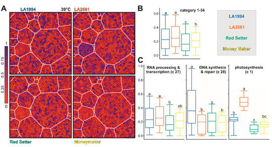 After the 39 °C treatment, the transcript levels of the selected genes are generally highest in LA1994 and LA2661 (Figure 6A,B). The largest difference in transcript abundance is seen for genes involved in photosynthesis (blue in LA2661, Figure 6A category 1), which show higher expression in LA2661 (Figure 6C). Moreover, transcripts of genes involved in DNA-based regulation are still the most abundant in LA1994, while the transcripts of genes involved in RNA-based regulation show the lowest abundance in Red Setter (Figure 6C).