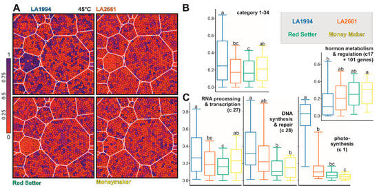 At 45 °C, the transcript level of the selected genes is globally reduced in LA2661 and Red Setter when compared to LA1994 (especially photosystem, blue in LA1994, Figure 7A,B). Further, in LA1994 an overall higher abundance of the transcripts of genes involved in photosynthesis, RNA- and DNA-based regulation, cell function and transport was observed (Figure 7C, Figure S5; Tables S9–S11). In turn, the transcripts of genes involved in hormone-based regulation show the lowest levels in LA1994 at this temperature (Figure 7C).