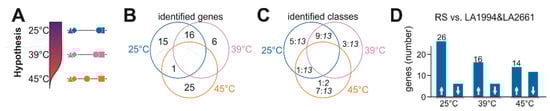 Analysis of genes differential regulated between HS sensitive and tolerant genotypes. (A) The hypothesis formulated on the basis of the physiological behavior is shown. (B) The number of genes selected by the described method (Section 2.8) and the overlap between the individual selections is shown. (C) The number of genes in specific class (number:class, as in Figure 3) is shown for the distribution presented in (B). (D) The number of genes with higher (first bar) or lower (second bar) transcript abundance at 25 °C (bar 1 and 2), 39 °C (bar 3 and 4) and 45 °C (bar 5 and 6) in Red Setter in comparison to LA1994 and LA2661 is presented.