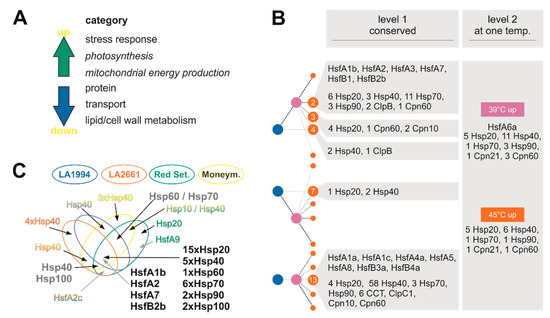 Hallmarks of the common response of tomato in response to elevated temperatures. (A) The categories enriched in upregulated or downregulated genes are shown. (B) The distribution of gene coding for heat shock proteins or the heat shock transcription factors in the different categories in Figure 3C is shown. (C) The distribution of gene coding for heat shock proteins or the heat shock transcription factors in the Venn diagram presented in Figure 3B is shown. Genes found in three species are shown in dark grey, genes shown in all species are shown in black, the others are color coded according to their occurrence.