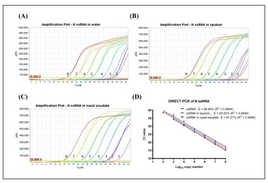 Amplification plot of SARS-CoV-2 N gene ssRNA control in (A) water, (B) spiked in sputum, and (C) spiked in nasal exudate conducted in the same thermocycler run. Numbers indicated the log10 copy number of the template present. No amplification was observed in the NTC. (D) Comparison of DIRECT-PCR assay amplification of SARS-CoV-2 N gene ssRNA control (blue line), N gene spiked in sputum (red line) and N gene spiked in nasal exudate (black line). Templates were ten-fold diluted in 8 orders of magnitude. Two microliters of template was used in 20 µL of PCR mastermix on the benchtop thermocycler. The amplification efficiency (E) was determined by plotting of mean Cq values against log10 copy number calculated using theoretical molarity of templates.