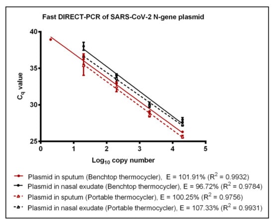 A commercially available portable qPCR thermocycler was validated by comparing to the benchtop thermocycler using the fast DIRECT-PCR assay of RNA and plasmid templates spiked in sputum and nasal exudate. The amplification efficiency of RNA control showed that there was no significant difference (p-value = 0.4344) between benchtop and the portable thermocycler. Both thermocyclers had similar LoD at 600 RNA copies per reaction (Table 1). When using RNA spike-in sputum, the portable thermocycler had LoD of 600 RNA copies per reaction (Cq of 36.25 ± 0.46) compared to six RNA copies per reaction when using the benchtop thermocycler (Table 1). On the other hand, both thermocyclers had the same LoD of 60 RNA copies per reaction when using RNA spike-in nasal exudate (Table 1). Using plasmid controls, there was no significant difference (p-value = 0.7799) in amplification efficiency between benchtop thermocycler and portable thermocycler (Figure 2). Next, using plasmids encoding the N gene of SARS-CoV-2 as control, the LoD was found to be 2 and 20 copies per reaction when using plasmid template and plasmid spike-in sputum for benchtop thermocycler and portable thermocycler, respectively. Both thermocyclers had similar sensitivity of 20 copies per reaction when using plasmid spike-in nasal exudate (Table 1). In terms of duration, the reaction took 49 min on the portable thermocycler and 36 min on benchtop thermocycler.