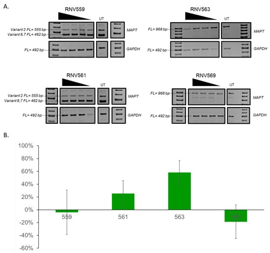Total RNA was extracted using the Bioline Isolate II RNA MiniPrep Kit (Bioline, Eveleigh, Australia; Cat# BIO-52073), following the manufacturer’s protocol. A total of 50 ng of total RNA was analysed using primer sets (ordered from IDT) listed in Table S4 of Supplementary Material, in the Superscript III One-Step RT-PCR System (ThermoFisher Scientific; Cat# 12574026), and the reaction conditions are given in Table S5 of Supplementary Material. The primers used to perform the RT-PCR were designed to amplify the longest MAPT isoform—variant 2. GAPDH was used as a loading control and the primer set (ordered from IDT), and RT-PCR conditions for GAPDH are given in Tables S4 and S5 of Supplementary Material. The products were separated on a 2% agarose gel in Tris-acetate-EDTA buffer, stained with Red Safe (iNtRON Biotechnology, Seongnam, South Korea; Cat# 21141), and destained with water, before being visualized with the Fusion Fx gel documentation system (Vilber Lourmat, Collégien, France).
