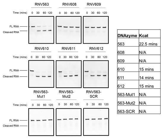 In vitro cleavage of the synthetic fluorescein dye (FAM)-conjugated MAPT RNA template by RNV563 and its derivatives. The table provides the catalytic activity. FL RNA, full-length FAM-conjugated RNA; cleaved RNA, cleaved FAM-conjugated MAPT RNA (22 nucleotides long). The FAM-conjugated template RNA is a small region of the MAPT transcript complementary to the hybridization arms of the DNAzymes. The gel images were cropped for a better overview. The original images are shown in Figure S4 (Supplementary Material).