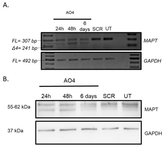 (A) Representative RT-PCR products of the MAPT transcripts from SH-SY5Y cells after treatment with an AO4 50 nM concentration and incubation of AO for 24 h, 48 h, and six days. RNA from AO4-treated samples was analysed using primer set 2. (B) Representative protein products of the MAPT and GAPDH transcripts from SH-SY5Y cells after treatment with AO4 at 50 nM concentrations and incubation of AO for 24 h, 48 h, and six days. RT-PCR products of the MAPT transcripts and protein products of the MAPT and GAPDH transcripts from SH-SY5Y cells after treatment with SCR at 50 nM concentrations and incubation of SCR for six days. FL, full-length; UT, untreated; SCR, scrambled sequence. GAPDH was used as a loading control. The gel images were cropped to highlight the MAPT-specific products and the corresponding house-keeping gene control GAPDH. The original images are shown in Figure S7 (Supplementary Material).