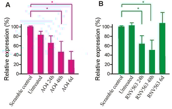 To further evaluate the efficacy of AO4 and RNV563 in inhibiting MAPT expression, the total MAPT protein level was evaluated in SH-SY5Y cells after 24 h, 48 h, and six days of transfection with AO4 and RNV563. Briefly, AO4- and RNV563-treated SH-SY5Y cells were incubated for 24 h, 48 h, and six days before collection. The cell pellet was collected and lysed, and the proteins were separated on a 10% separating gel and transferred onto a nitrocellulose membrane. The membrane was incubated with 1:2000 dilution of the MAPT (total tau) antibody overnight at 4 °C. The results clearly demonstrated that there was downregulation of the MAPT gene transcript and MAPT protein in cells 24 h, 48 h, and six days after AO4 treatment; however, the highest MAPT protein downregulation (74%) was seen six days after transfection (Figure 5 and Figure 6A for densitometry analysis). The results also demonstrated that there was downregulation of the MAPT protein in cells 24 and 48 h after RNV563; however the MAPT protein was close to MAPT protein levels in untreated and scrambled control-treated cells after six days of incubation. The highest MAPT protein downregulation (50%) was seen 48 hours after RNV563 transfection (Figure 6B for densitometry analysis, Figure S9B, Supplementary Material for western blot analysis).