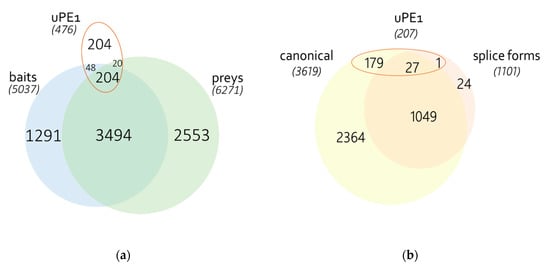 The authors of the BioPlex project constructed HA-FLAG-tagged open reading frames (ORFs). The description of the protein sequence is available for 5037 baits. According to the ORFEOME database [], 1424 sequences were represented by splice forms. Among these splice forms 70 belong to uPE1 proteins. However, only 204 of the 252 uPE1 proteins were identified as potential preys. In total, 3698 baits were also detected as preys: 2237 baits were presented in the original sequence, for 1440 cases, it was impossible to determine the specific form of the amino acid sequence (i.e., the master form), and for 22—another amino acid sequence was detected (Supplementary Figure S2a,b). It should be noted that among the baits represented initially by the canonical sequence for 37.6% of genes, there is no information about protein sequences resulted from alternative splicing.