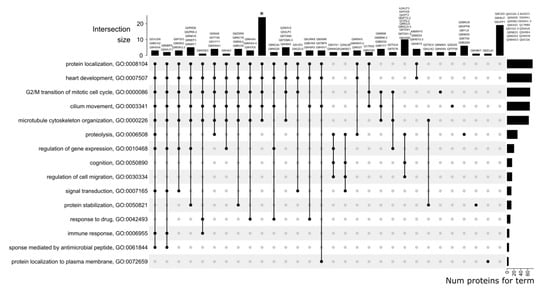 The right side of the graph shows the number of proteins annotated with the “biological process” according to the prediction. Five categories were predicted more frequently than others: protein localization (GO:0008104), heart development (GO:000750), G2/M transition of mitotic cell cycle (GO:0000086), cilium movement (GO:0003341), and microtubule cytoskeleton organization (GO:0000226). Taken together, these categories contain 68 proteins on average, while the remaining 11 categories contain an average of 12 proteins each. Moreover, a combination of these five categories was assigned for the largest number of proteins (24 proteins). For 10 proteins (A2RUT3, A6PVS8, Q6IPT2, Q6IPT2-2, Q7Z5L2, Q8N3J3, Q8N3J3-3, Q8TD91, Q8TD91-2, Q9HA90), a combination of biological processes including proteolysis (GO:0006508), cognition (GO:0050890), and regulation of cell migration (GO:0030334) was predicted. For 19 proteins (rightmost column), other BP categories were predicted (not shown on the plot).