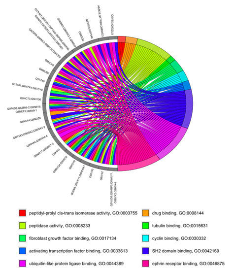 Since the total number of proteins and MF categories was less than in the case of BP prediction, we used a more descriptive type of plot [] to visualize the results (Figure 3). As before, the remaining GO categories were grouped into 10 clusters, and the category with the lowest level, i.e., the least specific, was selected as a representative of the cluster. The top-3 most-represented categories included SH2 domain binding (GO:0042169), ubiquitin-like protein ligase binding (GO:0044389), and ephrin receptor binding (GO:0046875).
