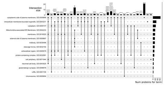 The COSNet algorithm was able to predict at least one cellular component for 295 of 406 uPE1 proteins, while the total number of distinct CC-terms was 71. The binary matrix with predictions is available in the Supplementary. The top-3 most represented predicted cellular components included cytosol (GO:0005829, 86 proteins), plasma membrane (GO:0005886, 84 proteins), and cytoplasm (GO:0005737, 83 proteins). After filtering rare GO categories and poorly annotated proteins, the prediction matrix was reduced to 93 proteins and 41 CC categories. Visualization of the distribution of proteins by cellular components is presented in Figure 4.