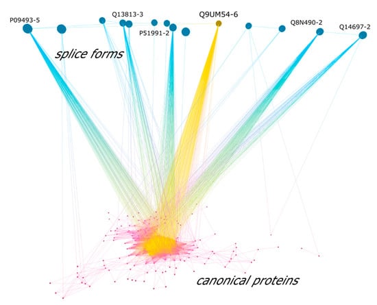 Based on the results, it can be carefully concluded that the dynamics and versatility of the interactome is ensured by changing the dominant splice form. This is consistent with observations on the relationship of specific splice forms and the development of pathologies [,]. A similar mechanism can be assumed in the case of other types of proteoforms. Thus, in order to understand the full potential of genes in cellular processes, we suggest one should focus on large-scale AP-MS experiments performed for various cell lines and under various conditions.