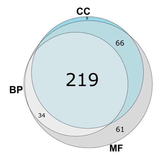 Venn diagram showing distribution of predicted uPE1 protein functions among GO (BP—biological process; MF—molecular function; CC—cellular component).