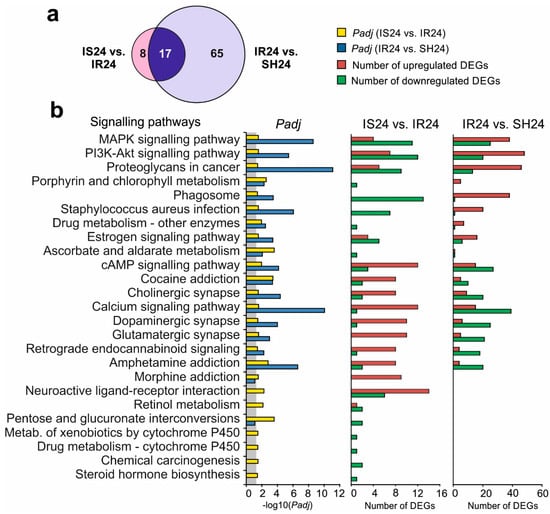 Analysis of the signalling pathways associated with DEGs at 24 h after tMCAO. (a) The numbers of signalling pathways overlapped in two pairwise comparisons: IS24 versus IR24 and IR24 versus SH24. (b) KEGG database analyses of DEGs in two pairwise comparisons IS24 versus IR24 and IR24 versus SH24 was carried out according to the DAVID database. The number of upregulated and downregulated DEGs, as well as the p-values adjusted using the Benjamini–Hochberg procedure (Padj), are shown. Only those genes and signalling pathways whose Padj < 0.05 were selected for analysis. Padj ≥ 0.05 are enclosed in the gray background.