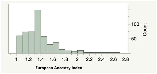The Distribution of the European Ancestry Index (EAI) in the FACHS Adult Subjects (n = 505). A score of 1 indicates the presence only alleles enriched in African subjects while a score of 3 indicates the presence of alleles enriched in European subjects.