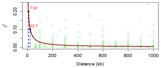 2.5. Linkage Disequilibrium (LD), Population Structure and Kinship Matrix