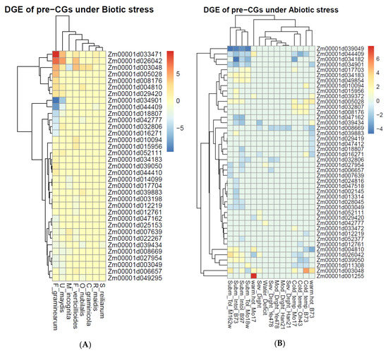 5.5. Pre-CGs Differentially Expressed under Biotic and Abiotic Stress Conditions