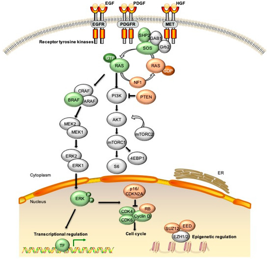 Signaling pathways altered due to genetic changes observed in malignant peripheral nerve sheath tumors (MPNST). The most common alterations in MPNST are loss of function of multiple tumor suppressors including NF1, p16/CDKN2A, TP53, and SUZ12/EED. Loss of NF1, as well as epigenetic changes due to loss of PRC2 components, leads to increased signaling through the RAS/RAF/MEK and PI3K/AKT pathways. Additional molecular events observed in subsets of MPNST include mutations in BRAF, amplification of EGFR or MET receptor tyrosine kinases (RTKs), and changes to chromatin structure through mutations in alpha thalassemia/mental retardation syndrome X (ATRX) and other epigenetic modifiers. EGF/EGFR = epidermal growth factor/receptor; PDGF/PDGFR = platelet derived growth factor/receptor; HGF = hepatocyte growth factor; ERK = extracellular signal regulated kinase; CDK = cyclin dependent kinase; RB = retinoblastoma; TF = transcription factor; ER = endoplasmic reticulum.