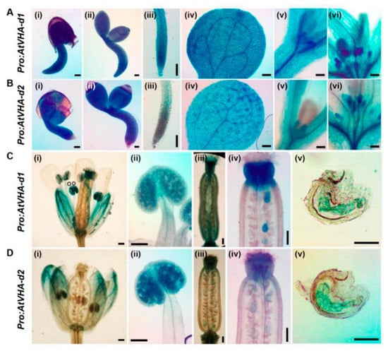 In the whole enzyme of V-ATPase, VHA-d is located on top of the ring formed by the six VHA-c subunits. Thus VHA-d participates in the control of either the reversible dissociation of V0 and V1 domains or coupling of proton transfer and ATP hydrolysis []. In yeast, VHA-d was found to be likely involved in the coupling of proton transport and ATP hydrolysis []. Furthermore, the structural stability of VHA-d depends on the formation of a disulfide bond []. In plants, only one study has shown that wheat (Triticum aestivum L.) VHA-d gene expression is induced by salt and abscisic acid []. The Arabidopsis AtVHA-d contains two isoforms, AtVHA-d1 and AtVHA-d2, which are located in close proximity on chromosome three and may have arisen from a gene replication event []. At present, the expression pattern, subcellular localization, and function of the AtVHA-d genes are not clear. In this study, we investigated the expression patterns of AtVHA-d genes by promoter-driven β-glucuronidase (GUS) expression. The subcellular localization of AtVHA-d2 was observed by a green fluorescent protein (GFP) marker, the expression of AtVHA-d genes under various stresses was analyzed by quantitative real-time PCR (qPCR), and the phenotype and root H+ flux of the atvha-d2 mutant under various stresses were investigated. Differentially expressed genes (DEGs) between the atvha-d2 mutant and wild-type were identified and validated by RNA sequencing (RNA-seq) and qPCR.
