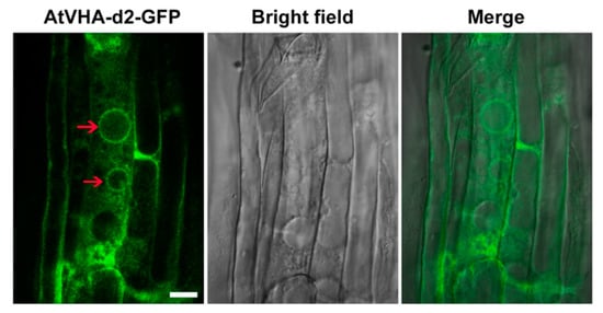 Subcellular localization of AtVHA-d2-GFP in Arabidopsis. Green fluorescent protein (GFP) fluorescence is green. Merge was created by merging the GFP and bright-field images. The red arrows indicate small vacuoles. Scale bar = 10 µm.