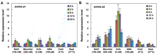 Expression analysis of AtVHA-d1 and AtVHA-d2 under multiple stresses. Ten-day-old Arabidopsis seedlings were treated with 150 mM NaCl, 300 mM mannitol, 5 mM H2O2, 100 µM ABA, 4 °C (cold), or 37 °C (heat) for 0, 3, 6, 12, and 24 h. The expression of AtVHA-d1 (A) and AtVHA-d2 (B) was investigated by qPCR. The AtActin2 gene was used as an internal control, and the transcript level in untreated seedlings was set as 1.0. Asterisks indicate a significant difference between untreated and stress-treated seedlings (* p < 0.05; ** p < 0.01; Student′s t-test). Error bars represent the SD (n = 3).