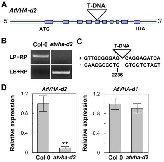 Identification of the Arabidopsis atvha-d2 mutant. Schematic representation of AtVHA-d2 (A) and genotyping (genomic DNA) (B). Original PCR detection pictures are shown in Figure S1. (C) The position of the T-DNA insertion in the atvha-d2 mutant. (D) Relative expression (mRNA) analysis of AtVHA-d2 and AtVHA-d1 in the atvha-d2 mutant by qPCR. Asterisks indicate a significant difference between Col-0 and atvha-d2 plants (** p < 0.01; Student’s t-test). Error bars represent the SD (n = 3).