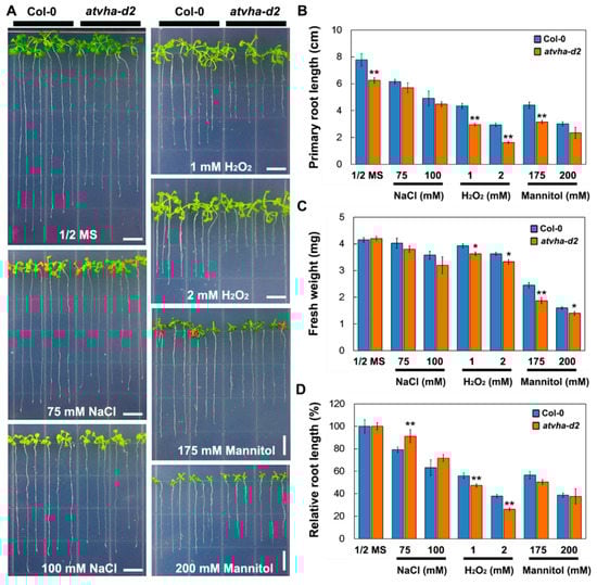Comparison of phenotypes of Col-0 and the atvha-d2 mutant under multiple stresses. Phenotypes (A), primary root length (B), relative root length (C), and fresh weight (D) of Col-0 and the atvha-d2 mutant grown on vertical plates containing 1/2 MS or 1/2 MS medium with NaCl (75 and 100 mM), H2O2 (1 and 2 mM), and mannitol (175 and 200 mM) for 14 d. Asterisks indicate a significant difference between Col-0 and atvha-d2 plants (* p < 0.05; ** p < 0.01; Student’s t-test). Error bars represent the SE (n = 3). Scale bar = 1 cm.