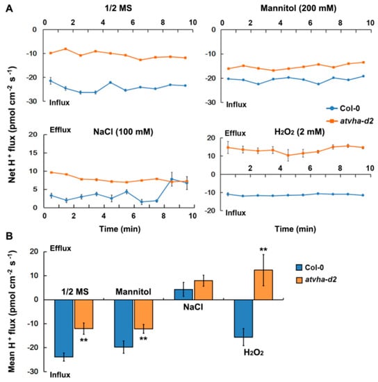 Net H+ flux in the roots of Col-0 and the atvha-d2 mutant under multiple stresses. Net (A) and mean (B) H+ flux in the root elongation zone of Col-0 and atvha-d2 seedlings (7-days-old) treated in 1/2 MS and 1/2 MS medium with mannitol (200 mM), NaCl (100 mM), and H2O2 (2 mM) for 24 h. Continuous flux was recorded for 10 min. Mean H+ flux from six samples (n = 6). Asterisks indicate a significant difference between Col-0 and atvha-d2 plants (** p < 0.01; Student’s t-test). Error bars represent the SE (n = 6).
