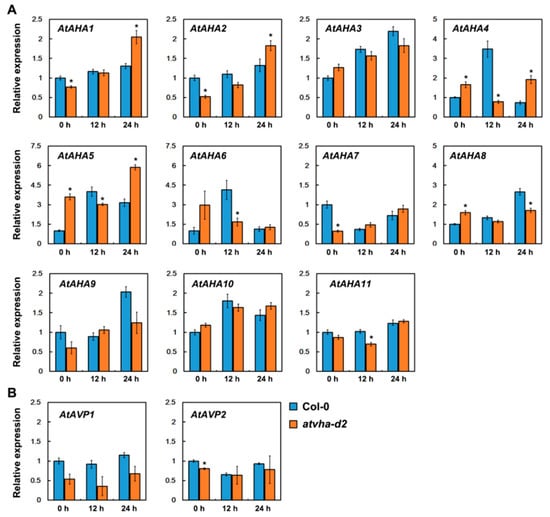 qPCR analysis of P-ATPase (AtAHA) and V-PPase (AtAVP) gene expression in Col-0 and the atvha-d2 mutant under normal and oxidative stress conditions. The P-ATPase gene family contains 11 members (AtAHA1 to AtAHA11) (A) and the V-PPase contains two members (AtAVP1 and AtAVP2) (B). Asterisks indicate a significant difference between Col-0 and the atvha-d2 plants (* p < 0.05; Student’s t-test). Error bars indicate the SD (n = 3).