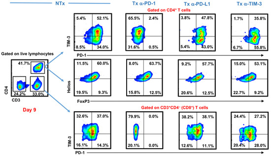 We also investigated the effects of different ICIs on expanded FoxP3+ Tregs. Tregs are known to be a key component of the immunosuppressive profile of the TME of various cancers, and their levels are frequently associated with disease progression [29]. We found that CD4+FoxP3+ Tregs were expanded in all conditions, and they also co-expressed Helios, an important transcription factor associated with stability and function of Tregs [30]. Importantly, we found that none of the ICIs affected the levels of CD4+FoxP3+Helios+/− Tregs (Figure 1).