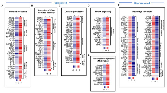 Atezolizumab downregulated pathways related to transcriptional regulation, Hippo signaling, acetylation, cancer related-pathways, angiogenesis, and integrins (−1.9 > Z-score < −0.5, Figure 5B). On the other hand, pathways related to anti-tumor responses, cell differentiation, apoptosis, chemokine/cytokine responses, immune response, the negative regulation of angiogenesis, the activation of the IFN-γ-mediated pathway, and MAPK signaling were upregulated (0.2 > Z-score < 1.9, Figure 5B).