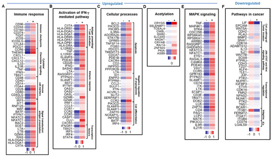 Differential gene expression of breast tumor-infiltrating immune cells in response to pembrolizumab treatment. Heatmaps show the Z-score calculated from the transcript per million (TPM) of each gene to compare the expression level in tumor-infiltrating immune cells treated with anti-PD-1 vs. non-treated cells. Each column represents a sample pooled from two explant cultures either treated or untreated, and each row represents the Z-score for mean expression obtained from two explant cultures (patients #57 and 59). The Z-score for mean expression level of each gene is depicted according to color scale. The functional categorization of top significantly upregulated and downregulated genes (with a fold change of >2 and p value <0.05 cutoffs) from CLC analysis were analyzed separately through DAVID platform. Genes involved in immune response (A), the activation of the IFN-γ-mediated signaling pathway (B), cellular processes (C), MAPK signaling (D), and genes related to transcriptional regulation via methylation (E) were upregulated in response to anti-PD-1, while genes in cancer-related pathways (F) were downregulated.