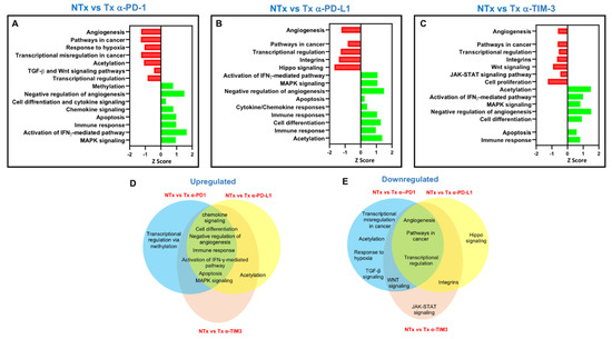 Anti-TIM-3 downregulated pathways related to transcriptional regulation, integrins, cell proliferation, cancer related-pathways, JAK–STAT signaling, angiogenesis, the negative regulation of apoptosis, and Wnt signaling (−1.3 > Z-score < −0.2, Figure 5C). On the other hand, pathways related to acetylation, cell differentiation, apoptosis, TGF-β signaling, immune response, the negative regulation of angiogenesis, the activation of the IFN-γ-mediated pathway, and MAPK signaling were upregulated (0.7 > Z-score < 1.9; Figure 5C).