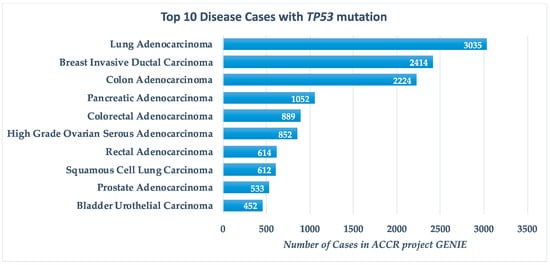 Top 10 disease cases with TP53 mutations, according to the GENIE (Genomics Evidence Neoplasia Information Exchange) project by AACR (American Association for Cancer Research).