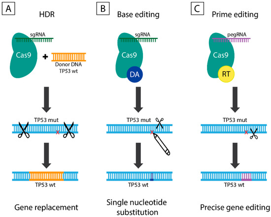 The diverse approaches for TP53 gene editing: DSB-mediated gene replacement by a normal copy, precise TP53 editing by base editors and prime editors that do not require DSBs. (A) HDR is a DSB-mediated DNA repair mechanism that requires exogenously introduced homology sequence template prior ligation. HDR is active in S/G2 phase of the cell cycle and allows target sequence modifications ranging from a single nucleotide substitution to insertion of large nucleotide sequences into a target locus. (B) Base editors consist of a nickase Cas9 (nCas9 with D10A mutation) fused to either cytidine deaminase or adenosine deaminase and mediate C to T or A to G conversion in genomic DNA, respectively. (C) Prime editors exemplify a so-called “search-and-replace” technology, whereby new genetic information is directly introduced by means of nCas9-RT fusion protein guided by pegRNA that both specifies the target DNA sequence and encodes the desired edits. DA—deaminase; DSB—double-strand break; RT—reverse transcriptase.