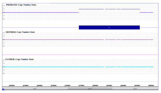 SNP-array analysis of the patient revealed microduplication involving the 16q24.2q24.3 chromosome region. The duplicated region was 2.2 Mb in size and covered by 1664 SNP array probes. Carrier testing in the parents, performed by chromosome microarrays analysis (CMA) using the same platform (i.e., CytoScan HD Array), resulted in normal outcomes indicating a de novo origin of the 16q24.2q24.3 microduplication in the patient (Figure 1).