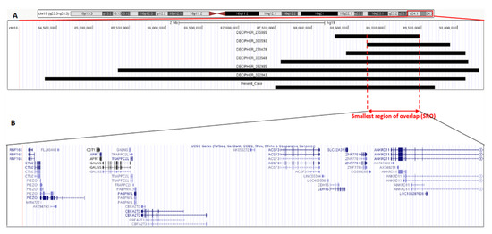 Schematic representation of chromosome 16q24 from 84 to 90,5 Mb (assembly GRCh37/hg19) indicating (A) the duplicated region in our patient and in the patients from DECIPHER (black bars). Red vertical dashed lines delimitate the smallest regions of overlap (SRO) among all patients. (B) Genes included in the SRO (RNF166, CTU2, PIEZO1, CDT1, APRT, GALNS, TRAPPC2L, PABPN1L, CBFA2T3, ACSF3, CDH15, SLC22A31, ZNF778, ANKRD11).