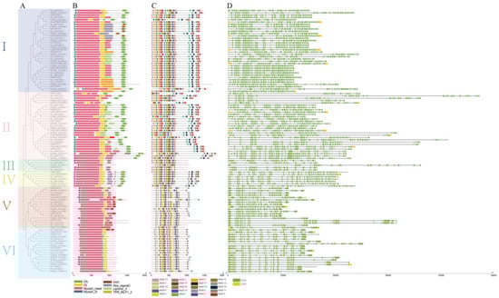Comparison of the gene structures, domin, and motif distribution pattern of Myosin genes in four cotton species. (A) The phylogenetic tree of Myosin genes. (B) The distribution pattern of predicted motifs in the Myosin genes. (C) The distribution pattern of predicted domain in the Myosin genes. (D) The position of exons and introns within Myosin genes. Exons, UTR, and introns are shown by green boxes, yellow boxes, and black lines, respectively.