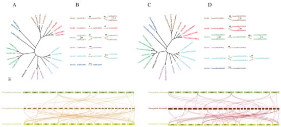 Gene Duplication, collinearity, and evolutionary analysis. (A) The phylogenetic tree between Amborella trichopoda and Gossypium arboreum Myosins. (B) The Gossypium arboreum Myosins expansion pathway. The arrows point to new genes generated by gene expansion events and the character above the arrow I, II, III, IV, V, V-T, and NA means the ancestors of cocoa and cotton differentiated from Arabidopsis at about 93 MYA (million years ago), the differentiation time between cotton and cocoa at about 33 MYA (million years ago), ancestral cotton WGD event at 13∼20 MYA (million years ago), the differentiation time between Gossypium arboreum and Gossypium raimondi at about 2∼13 MYA (million years ago), tetraploid cotton formed in 1.5 MYA (million years ago), tandem event after tetraploid cotton formation, and unknown event, respectively. (C) The phylogenetic tree between Amborella trichopoda and Gossypium raimondi Myosins. (D) The Gossypium raimondii Myosins expansion pathway, the meaning of arrows and character was same as described in (B). (E) The collinear relationship of homologous genes between Gossypium arboreum, Gossypium raimondii, and Gossypium barbadense, Gossypium hirsutum.