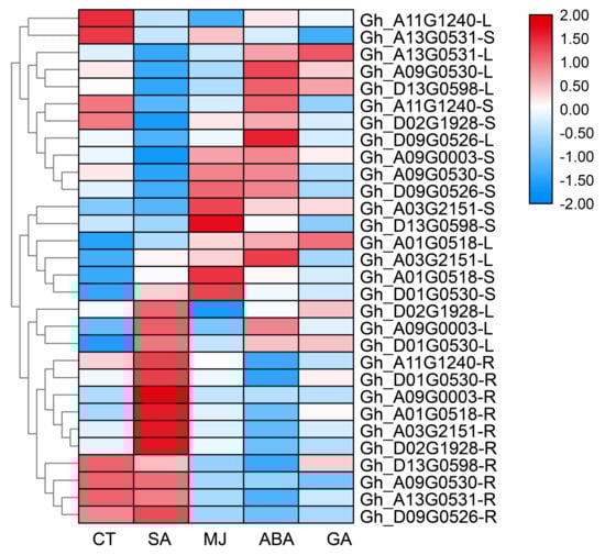 The expression of ten Gossypium hirsutum Myosins. CT, SA, MJ, ABA, and GA mean control and different hormone treatment like salicylic acid, methyl jasmonate, abscisic acid, and gibberellic acid. The letters S, L and R after the gene name represented the root, leaf and stem organs of the cotton.
