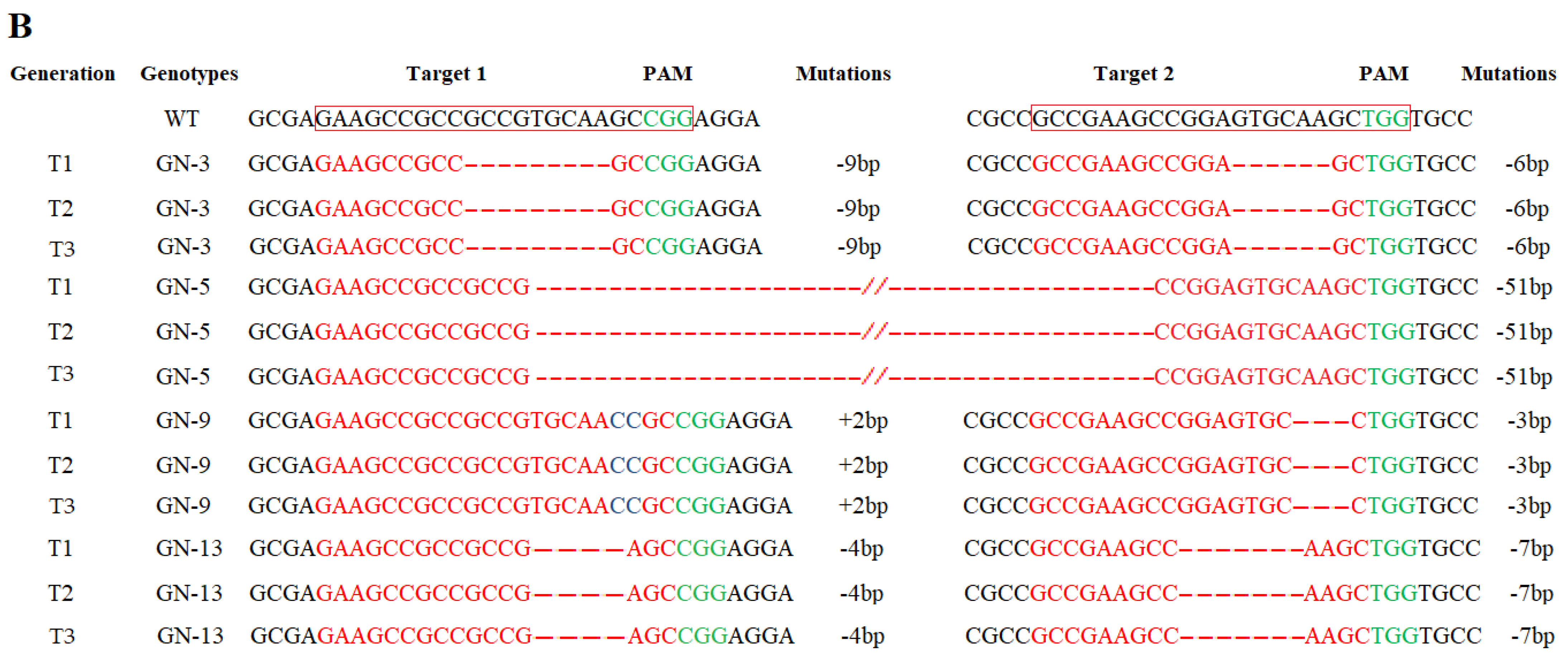 2.3. Genotyping, Screening of Transgene-free Plants, and Off-target Assessment