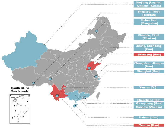 A total of 870 male unrelated samples of Chinese Han ancestry were collected with appropriate informed consent, consisting of blood samples provided on Flinders Technology Associates (FTA) cards (Whatman International Ltd., Maidstone, UK). Among them, 565 lived in Zhaotong City, Yunnan Province, while the rest (n = 305) lived in Zibo City, Shandong Province, and the male ancestors of all donors had been living in the sampling sites for three generations. As Figure 1 shows, the geographic locations of Shandong and Yunnan Han populations are indicated in red, and the referenced populations are in azure.