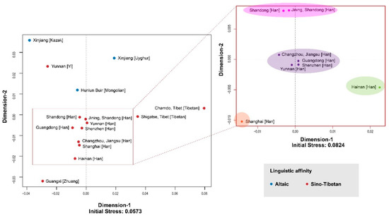In Figure 2, two MDS plots ware illustrated to explain the genetic landscape of various Chinese ethnic groups (initial stress = 0.0573), as well as the genetic make-up of Han groups (initial stress = 0.0824). Both plots reached a good quality of configuration. The results for the Altaic- and Sino-Tibetan-speaking groups complied with the AMOVA results, except for Yunnan Yi population, which may be caused by its small sample size. The distribution pattern on the abscissa axis explained the divergence between Chinese Han and Tibetan groups. As is known to all, genetics is strongly correlated with linguistics, as language carries cultural information. Inter-disciplinary efforts by archaeology, genetics, and linguistics help provide insights into historical human evolution [46,47]. The latest linguistic finding by Zhang et al. showed that the Chinese Han and Tibetan subgroups originated from a Sino-Tibetan language family which diverged about 4200–7800 years BP (before present), with an average value of 5900 years BP [48]. The phylogenetic evidence could be traced back to the late Neolithic.